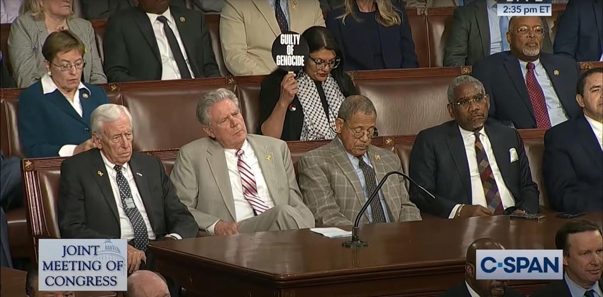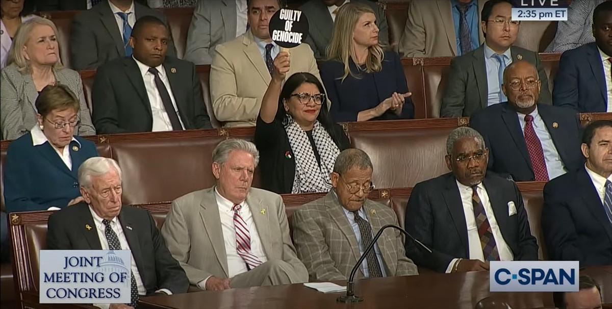 ABD Kongresi'nin Filistin kökenli tek üyesi Rashida Tlaib'in Netanyahu'nun konuşması boyunca elinde, "Savaş suçlusu" yazan bir pankart tuttuğu görüldü.