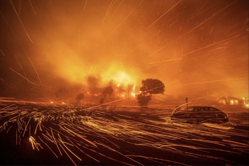 7 Ocak'ta Kaliforniya, Los Angeles'ın batı yakasında çıkan Palisades yangını, şiddetli bir rüzgar fırtınası sırasında közleri savuruyor.