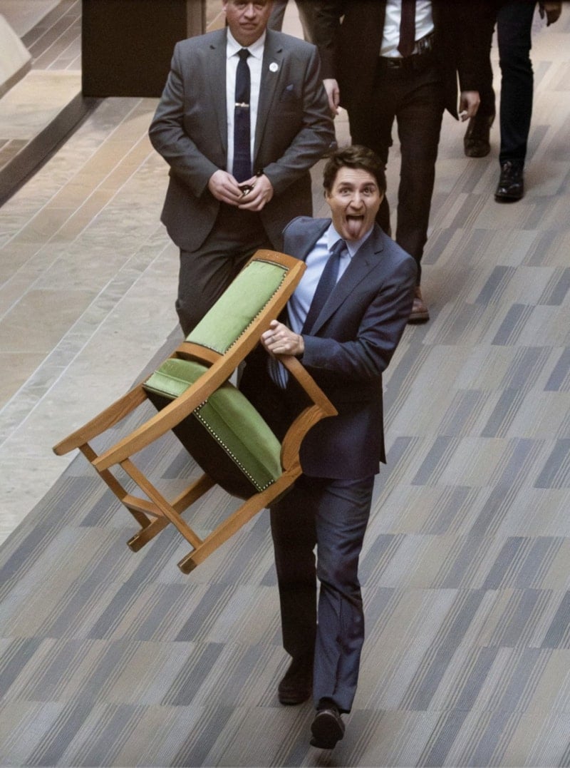 Kanada Başbakanı Justin Trudeau, 10 Mart'ta Ottawa'daki Parlamento Binası'nda bulunan Avam Kamarası'ndan sandalyesini taşıyor.
