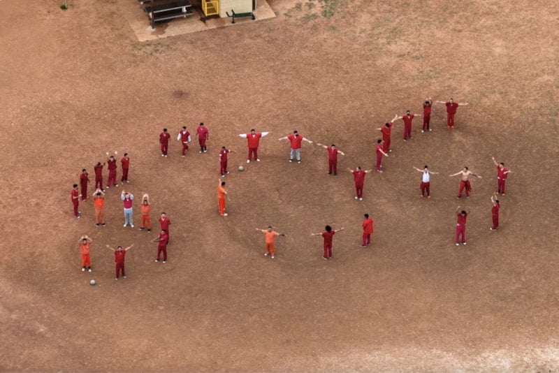 28 Nisan'da Teksas'ın Anson kentinde, ABD Yüksek Mahkemesi kararının merkezinde yer alan Venezuelalıların tutulduğu Bluebonnet Gözaltı Tesisi'nin avlusunda, tutukluların bedenleriyle SOS harflerini oluşturduklarını gösteren bir drone görüntüsü.