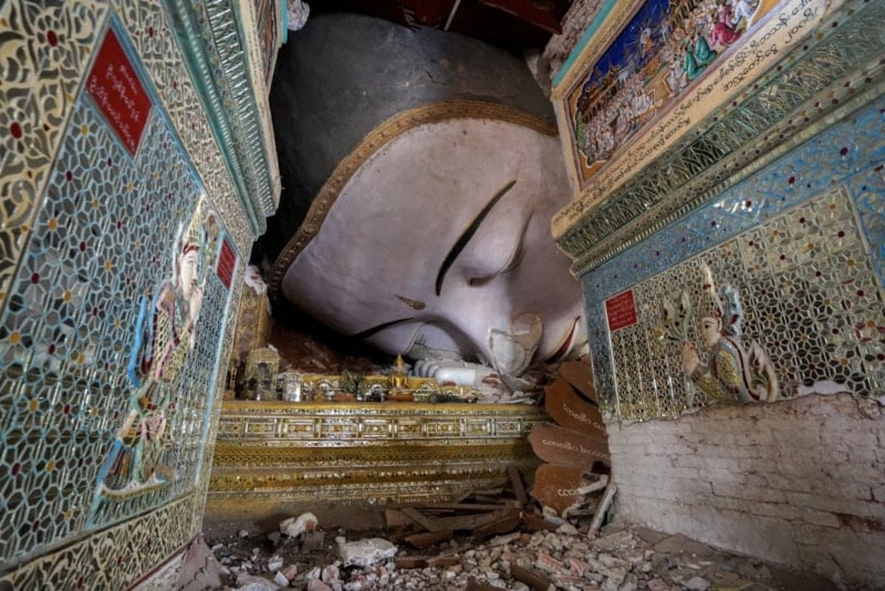 Myanmar'ın Mandalay kentinde, 3 Nisan'da meydana gelen depremin ardından bir pagodanın içinde hasar görmüş, yere yatmış bir Budist heykeli görüntülendi.