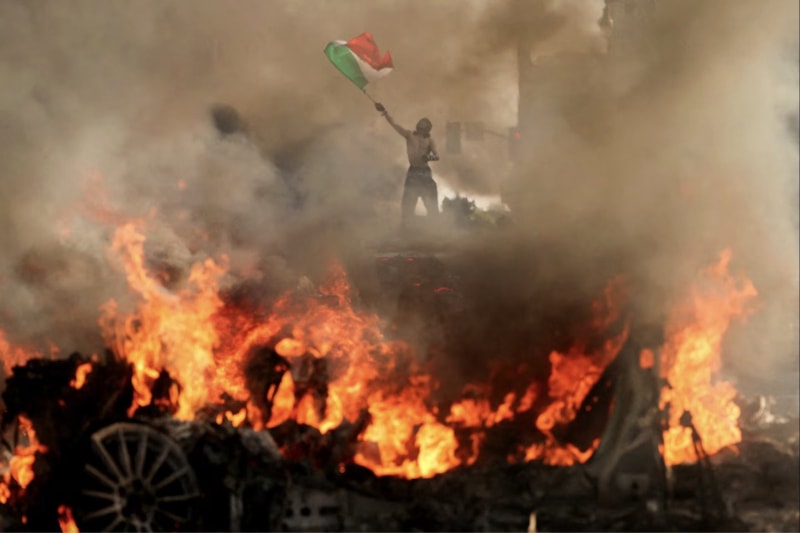 8 Haziran'da Kaliforniya'nın Los Angeles kentinde, Los Angeles Belediye Binası yakınlarında, federal göçmen operasyonlarına karşı düzenlenen protesto sırasında, yanan bir araçtan duman ve alevler yükselirken bir adam Meksika bayrağı sallıyor.