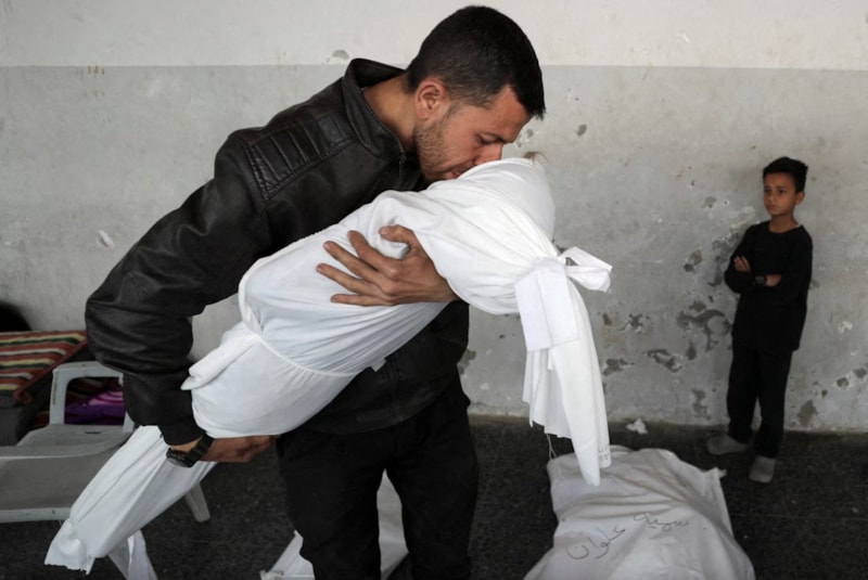 Filistinli bir adam, 21 Mayıs'ta Gazze şehrindeki El-Ahli Arap Baptist hastanesinde İsrail saldırısında öldürülen 5 yaşındaki yeğeni Nur Nabhan'ın cesedini öpüyor.