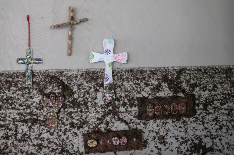 Guadalupe Nehri'nde meydana gelen selin ardından, 7 Temmuz'da Teksas'ın Hunt kentindeki Camp Mystic'te, su seviyesinin yüksekliğini gösteren işaretlerle birlikte bir duvardan haçlar sarkıyor.