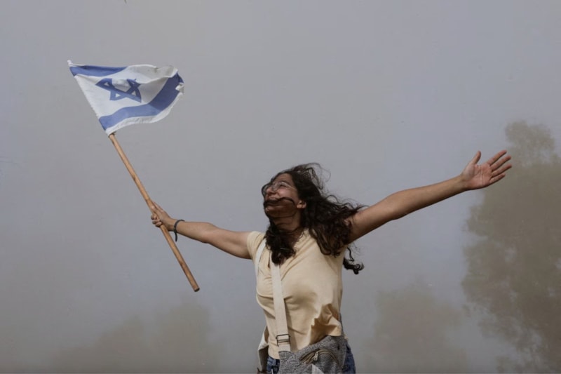İsrail ile Hamas arasında yapılan esir takası ve ateşkes anlaşmasının bir parçası olarak diğerleriyle birlikte serbest bırakılan rehineleri taşıyan helikopterin kalkışı sırasında, İsrail bayrağı tutan bir kişi toz bulutunun ortasında tepki veriyor, Reim, güney İsrail, 13 Ekim.