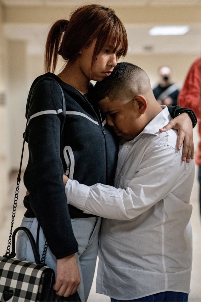 22 Ağustos'ta New York, Manhattan'daki ABD göçmenlik mahkemesinde, gözaltına alınan göçmen bir annenin çocuğu, federal göçmenlik memurları babayı ek evraklar için sorgularken ağlıyor.