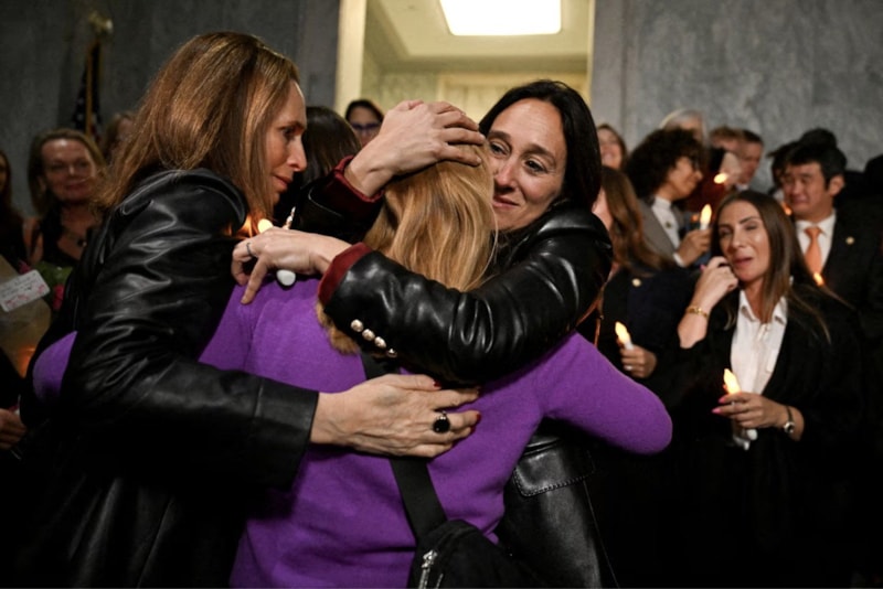 Dünya Sömürüsüzlük Örgütü'nün Ulusal Direktörü Lauren Hersh, 18 Kasım'da Washington'daki Capitol Hill'de, Senato'nun merhum cinsel suçlu Jeffrey Epstein ile ilgili dosyaların yayınlanmasını zorunlu kılan yasa tasarısını geçirmesinin ardından Jeffrey Epstein mağduru Liz Stein'ı kucaklıyor.