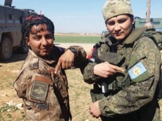 Rus askerleri terör örgütü PKK'nın Suriye kolu SDG'ye bağlı Menbiç Askeri Konseyi'ne ait armaları kullanıyor.