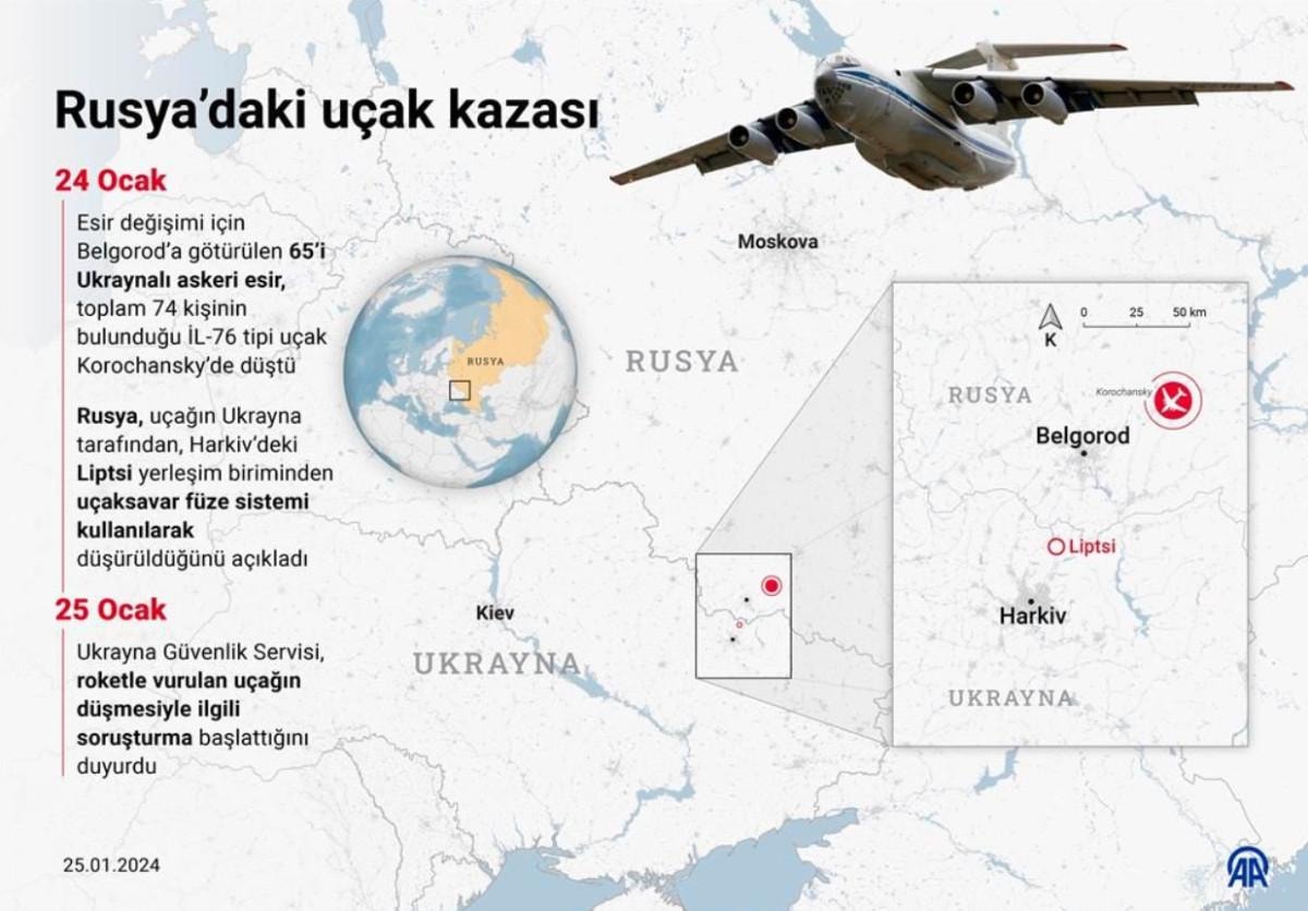 Rusya’da dün düşen ve 65'i Ukraynalı esir asker olmak üzere 74 kişinin öldüğü İL-76 askeri nakliye uçağı ile ilgili soruşturma devam ediyor.