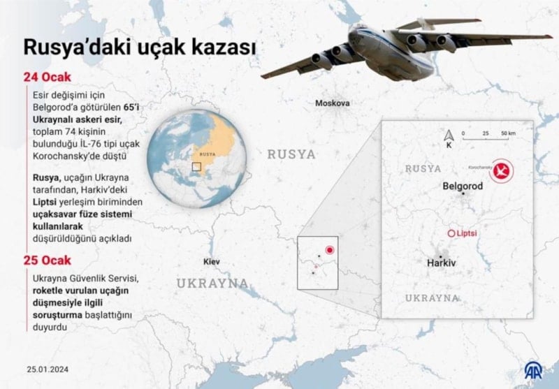 Rusya Soruşturma Komitesinden, Rusya’da düşen askeri nakliye uçağı ile ilgili yapılan açıklamada, "Ukraynalı esirleri taşıyan uçak, Ukrayna tarafından füzeyle vuruldu” ifadeleri kullandıldı.