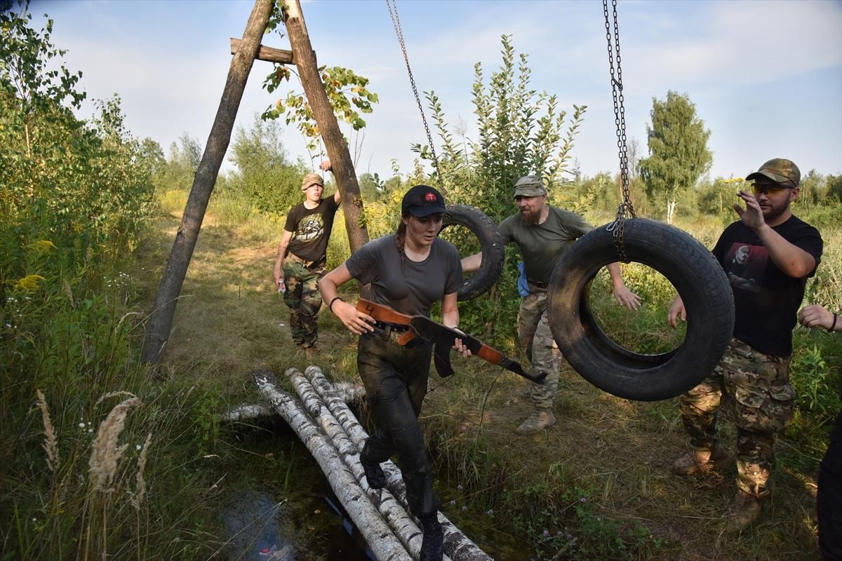 Ukraynalı gençler bu eğitimleri sırasında ordu standartlarına yakın engel parkurunu aşmaya çalışırken objektiflere yansıdı.
