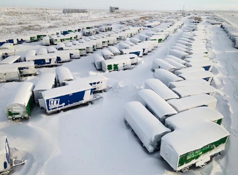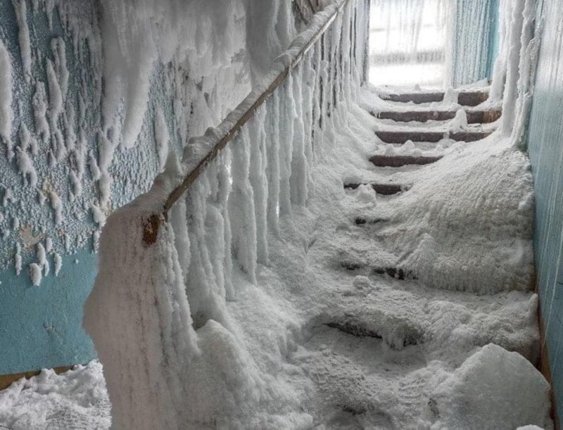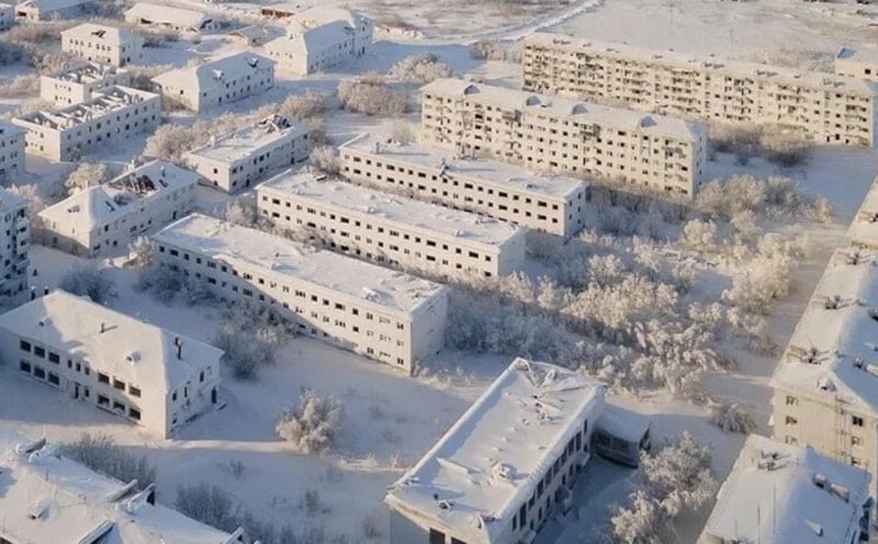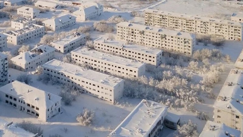 Bölgenin sert kutup ikliminde inşa edilen toplu konut tarzındaki evlerin bacaları artık duman çıkarmıyor ve binalar buzla kaplanmış durumda.