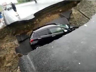 Aşırı yağan yağmur, 10 metre uzunluğunda ve 2 metre derinliğinde bir çukur oluşmasına neden oldu. Seyir halindeki bir otomobil ise bu çukura düştü.