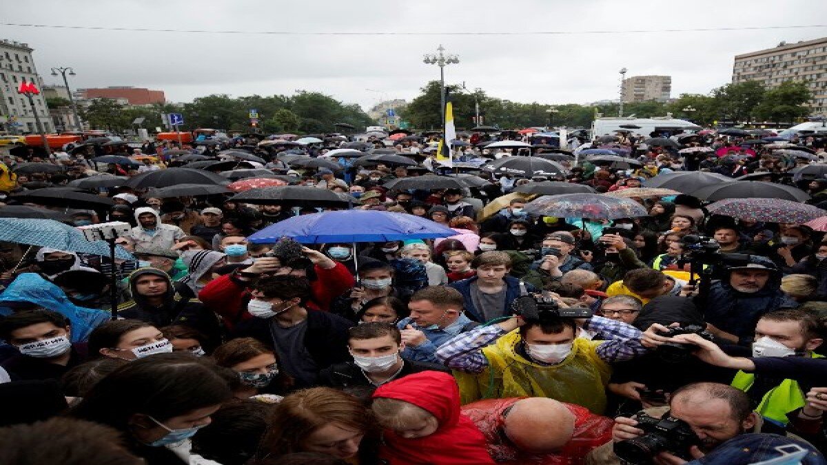 Putin'in aleyhinde sloganlar atan göstericiler, ülkede anayasayı değiştiren halk oylaması sonuçlarının iptal edilmesi için imza topladı.