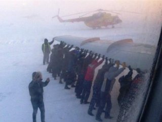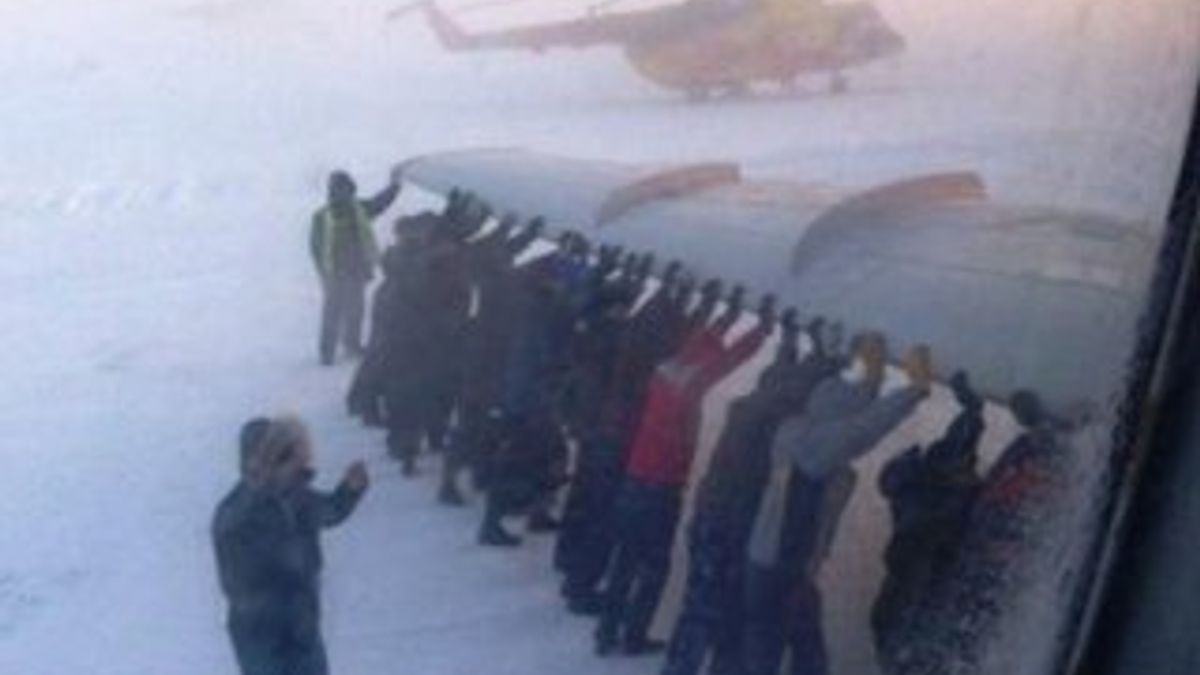 Rusya'nın Sibirya eyaletinin Krosnoyarsk şehrindeki İgarka Havalimanını'nda eksi 50 derece soğuktan dolayı tekerleri donan uçağı, yolcuların iterek hareket ettirmesi kameralara yansıdı.