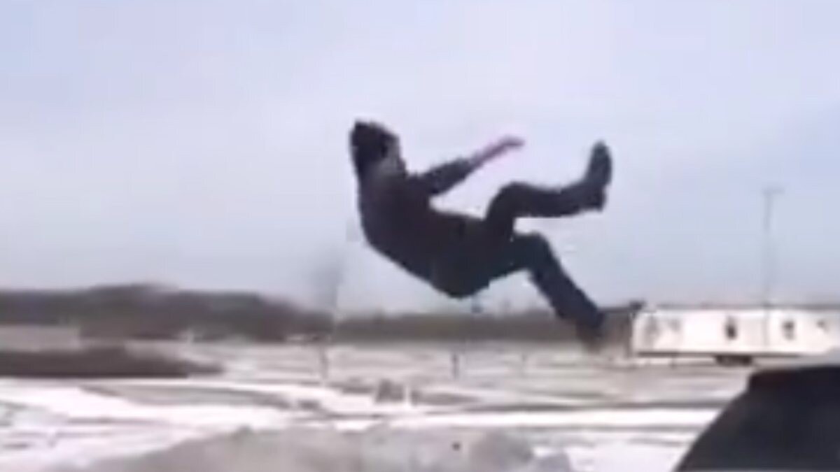 Sosyal medyada paylaşılan görüntülerde, aracın üzerindeki adam, sertliğini hesaba katmadığı kar kütlesinin üzerine atladı.