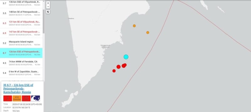 Rusya'nın doğusundaki Kamçatka bölgesi yakınlarında 8.8 büyüklüğünde güçlü bir deprem meydana geldi.