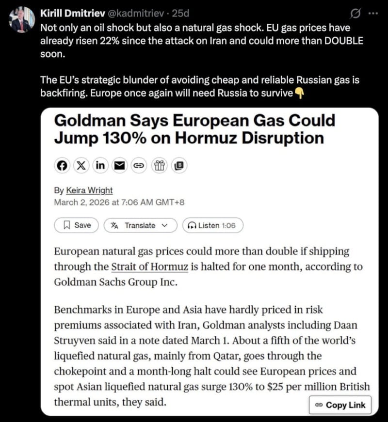 Rusya Doğrudan Yatırım Fonu Başkanı da olan Dmitriyev paylaşımında, Goldman Sachs'in Avrupa'daki doğalgaz fiyatlarının yüzde 130 artabileceğine yönelik raporunu alıntılayarak "Sadece bir petrol şoku değil, aynı zamanda bir doğal gaz şoku." ifadelerine yer verdi.