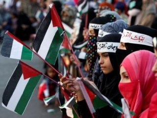 Göstericiler, "Dur Trump", "Ellerini Kudüs'ün üzerinden çek" ve "Kudüs, Filistin'in başkentidir" yazılı dövizler ile Trump'ın elini kanlı gösteren görseller taşıdı.
