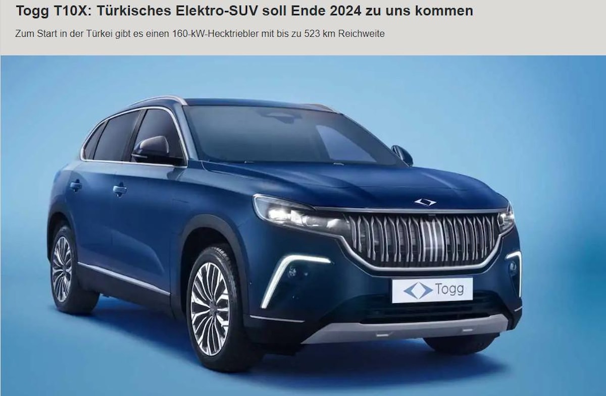 Milli bir proje kapsamında Türkiye'de üretilen elektrikli otomobilin piyasaya sürüldüğü, SUV T10X'i Sedan'ın takip edeceği kaydedildi. Araçların, Alman pazarına girmesinin beklendiği ifade edildi ve şöyle denildi: