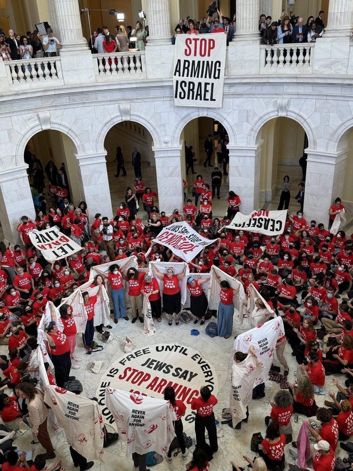 “İsrail’i silahlandırmayı bırakın” ve “Bizim adımıza değil” yazılı tişörtler giyen ve “Bırakın Gazze yaşasın” ve “Yahudiler soykırımı durdurun diyor” pankartları taşıyan grup, İsrail’in Gazze’ye yönelik saldırılarına tepki göstererek, ABD hükümetine İsrail’e silah satışını durdurma çağrısı yaptı.