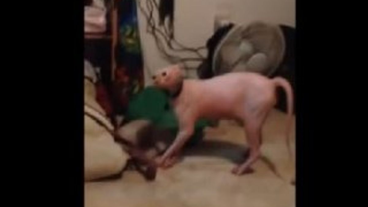 Sahibinin kendisini maske takarak korkutması üzerine hem korkup hem de peşinden giderek tepki gösteren Sfenks kedisinin sevimli halleri kameralara yansıdı. Diğer yandan kedinin, diğer kedilerden farklı olarak tüysüz olması ise dikkat çeken başka bir ayrıntı oldu.
