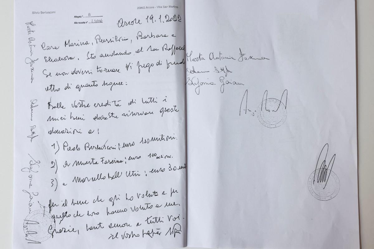 Silvio Berlusconi'nin vasiyetnameye ek olarak, 19 Ocak 2022 tarihli bir mektup bıraktığı, bu mektupta da nişanlısı Marta Fascina ve siyasetten yol arkadaşı Marcello Dell'Utri'ye yönelik vasiyetlerinin olduğu ve çocuklarına hitaben şu ifadelerin yer aldığı belirtildi: