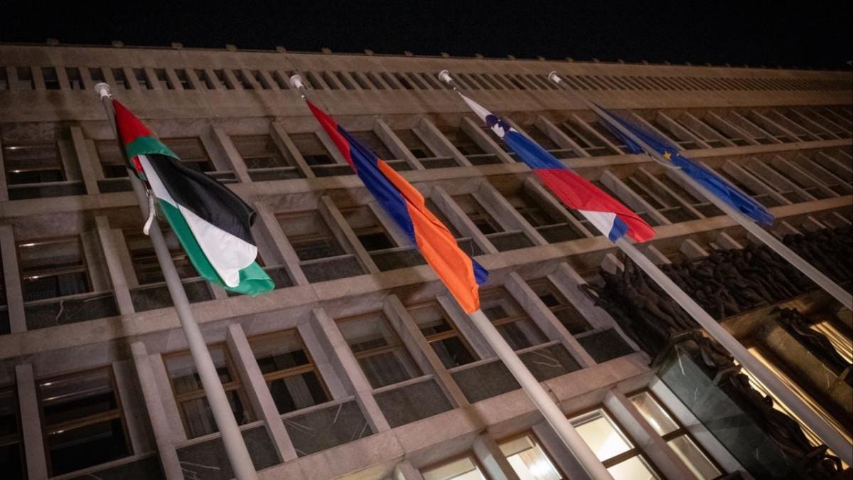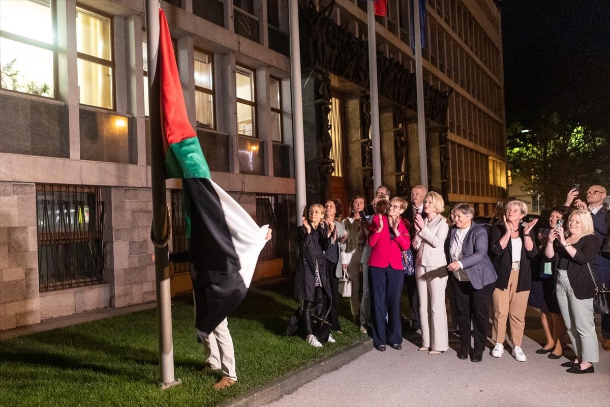 Slovenya meclisinin Filistin'i devlet olarak tanıma kararının ardından Filistin'in bayrağı, başkent Lübliyana'daki meclis bahçesinde bulunan alandaki bayrakların yanında, alkışlar eşliğinde göndere çekildi.