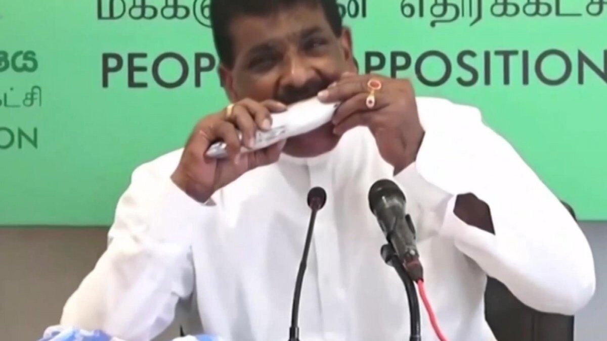 Basın toplantısında çiğ balık yiyen Wedaarachchi, “Bu balığı size göstermek için getirdim. Bu balığı yemeleri için bu ülkenin insanlarına çağrıda bulunuyorum. Korkmayın. Koronavirüsten enfekte olmayacaksınız.” dedi.