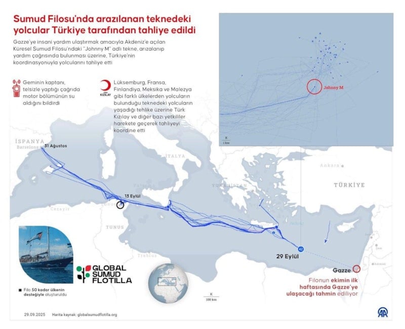 Gazze'ye insani yardım ulaştırmak amacıyla Akdeniz'e açılan Küresel Sumud Filosu’ndaki "Johnny M" adlı teknenin su alarak arızalanıp yardım çağrısında bulunması üzerine yolcuları, Türkiye'nin koordinasyonuyla tahliye edildi.