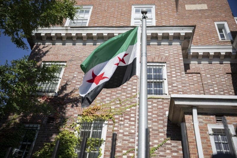Suriye Arap Cumhuriyeti bayrağı, ABD'nin başkenti Washington'da bulunan Suriye Büyükelçiliği binasında göndere çekildi.