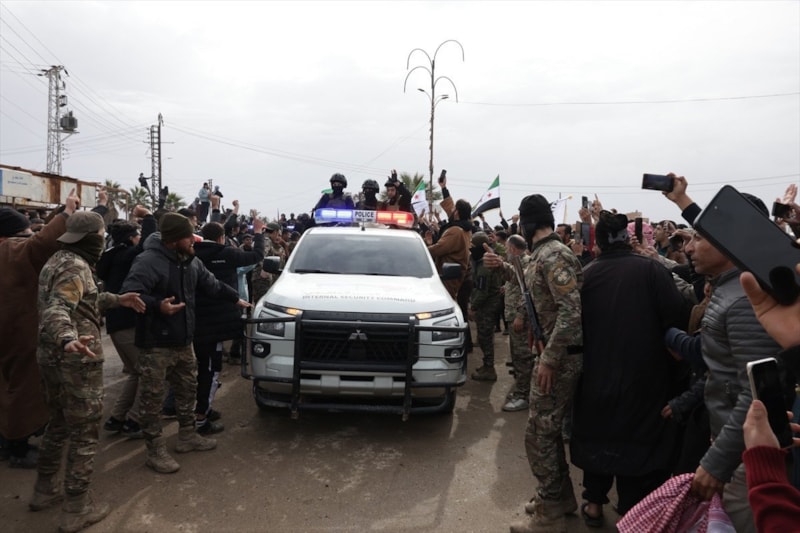 Suriye İçişleri Bakanlığına bağlı yaklaşık 20 askeri araçtan oluşan konvoy, Kamışlı kentine doğru ilerlerken, güzergah üzerindeki bölge sakinleri tarafından coşkuyla karşılandı.