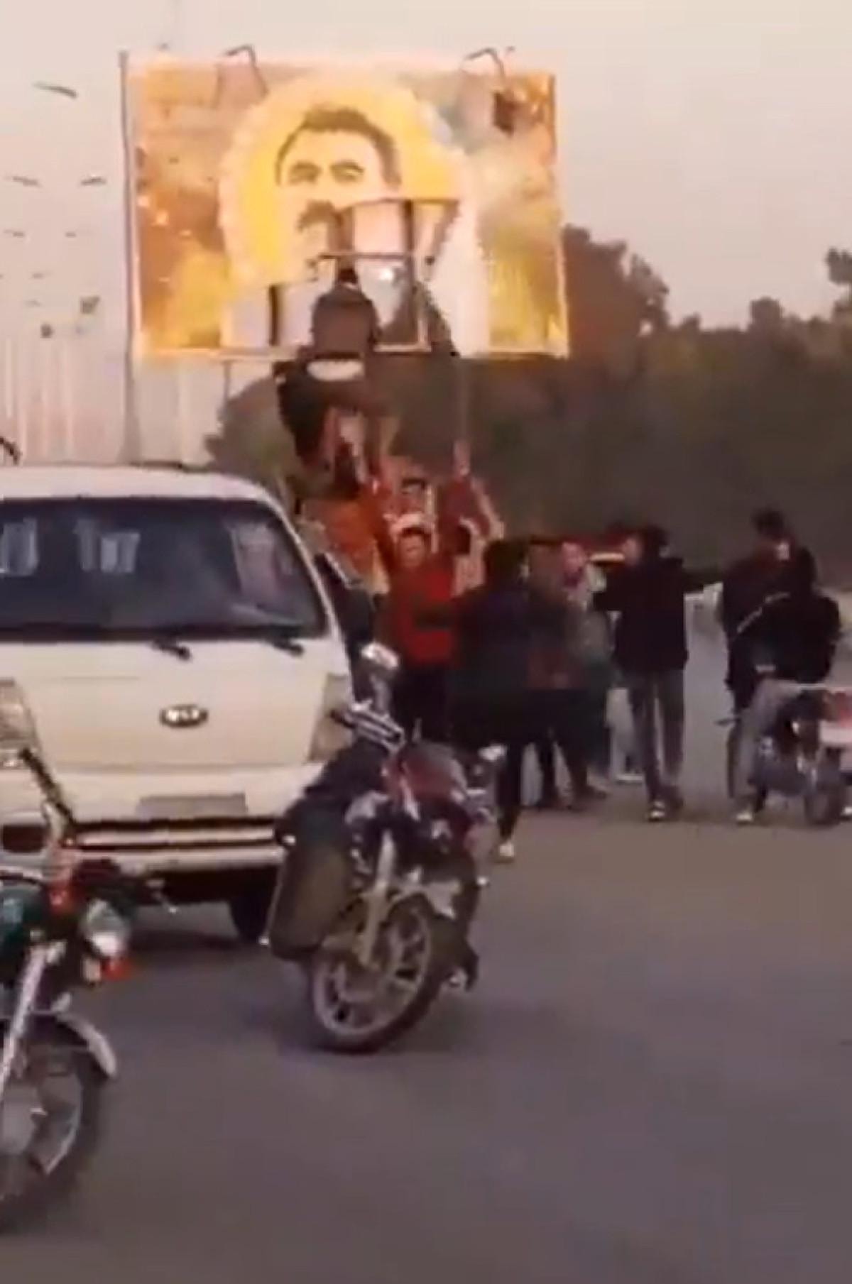 Öcalan'ın posterlerini parçalayan grubun alkışlı sevinci kameralara yansıdı.