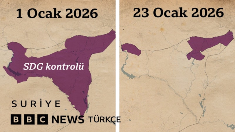 İngiliz yayın kuruluşu BBC'nin Türkçe kanalı, YPG/SDG'nin yaşadığı kaybı harita ile dramatize etti.