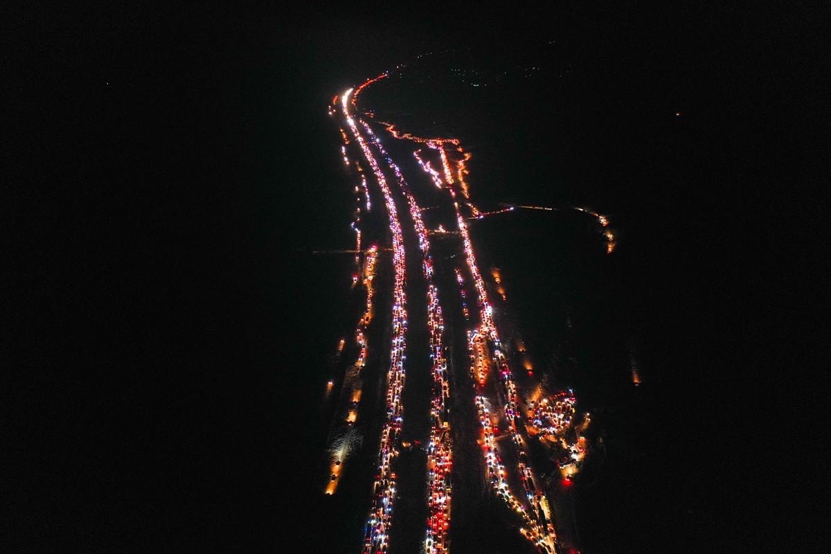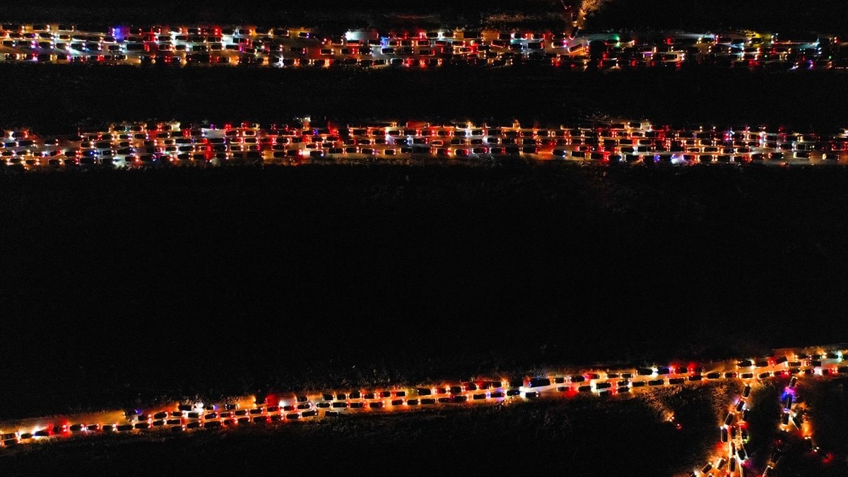 Şam'a gidiş ve dönüş yolunda uzun araç kuyrukları oluştu. Yaşanan trafik havadan görüntülendi.