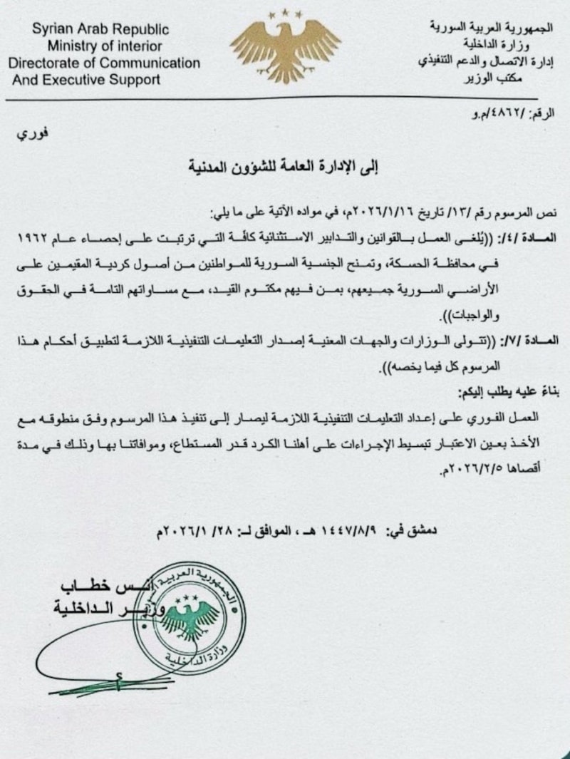 Suriye İçişleri Bakanlığı, Suriye vatandaşlığı verilmeyen Kürtlere vatandaşlık tanıyan kararnamenin uygulanması talimatını verdi. Kararnamede, "Hak ve yükümlülükler bakımından tam eşitlik esasına göre Suriye vatandaşlığı verilir" ifadeleri yer aldı.