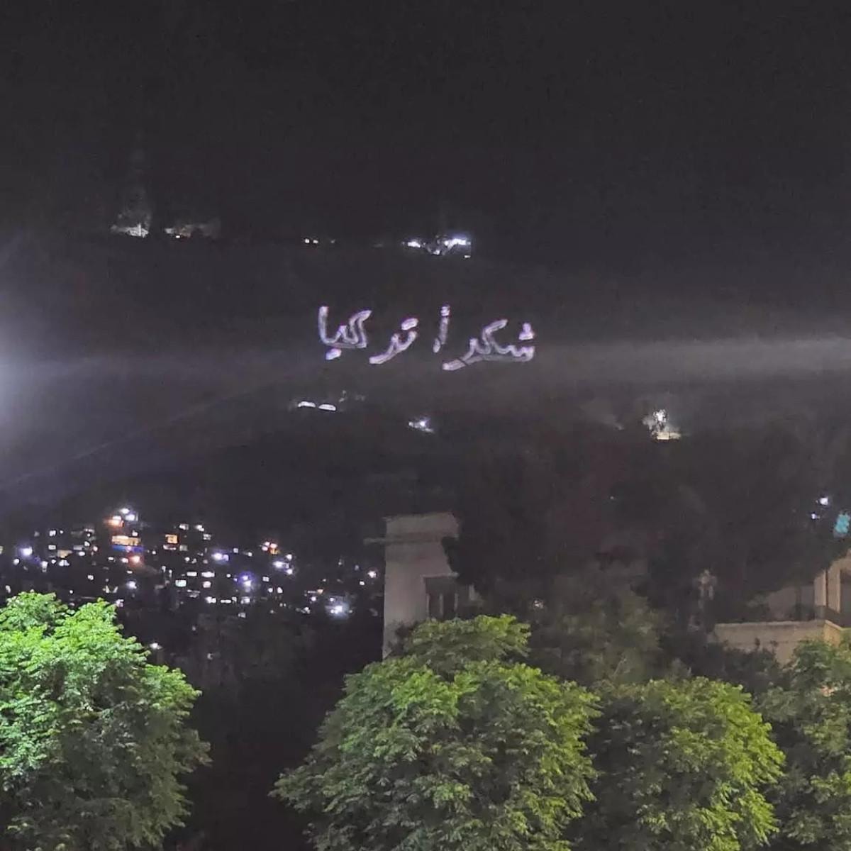 Suriye'nin başkenti Şam'daki Kasyun Dağı'na, Türkiye'nin ABD yaptırımlarının kaldırılmasına yönelik desteğine teşekkür amacıyla "Teşekkürler Türkiye" mesajı yansıtıldı.