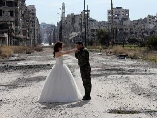 Savaş yıkıntıları arasında, kabarık beyaz gelinliğiyle genç bir kadın, Suriye ordusu üniforması giymiş genç bir erkek ve ikilinin romantik pozlarını ölümsüzleştiren bir fotoğrafçı.