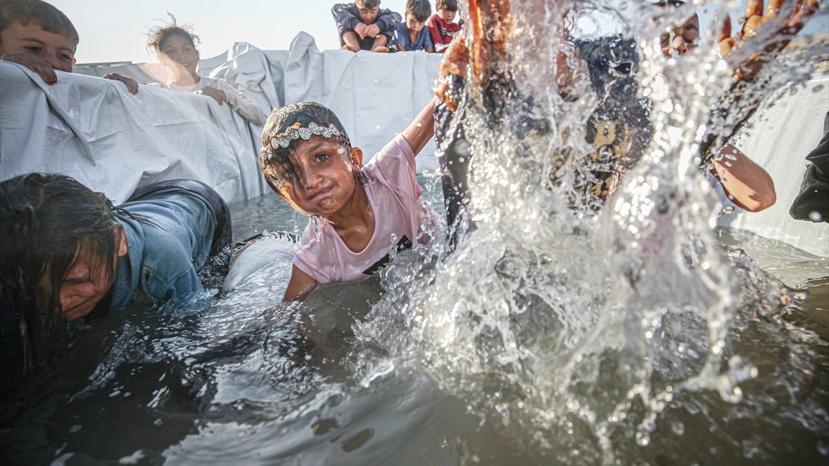 Kendi topraklarından uzakta patlama seslerini duymadan gönüllerince eğlenen çocukların havuz keyfi, gün kararıncaya kadar sürdü.