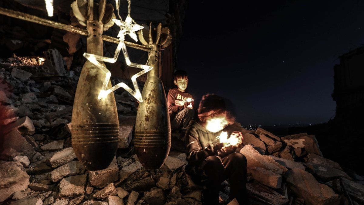 Yeni yıla umutla girmek isteyen Suriyeli çocuklar, savaşın getirdiği yıkıma dikkat çekmek için İdlib'te yıkılan bir evin enkazında roket kalıntılarını aydınlattı.