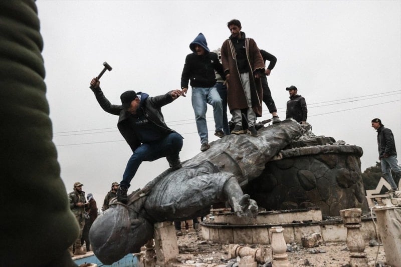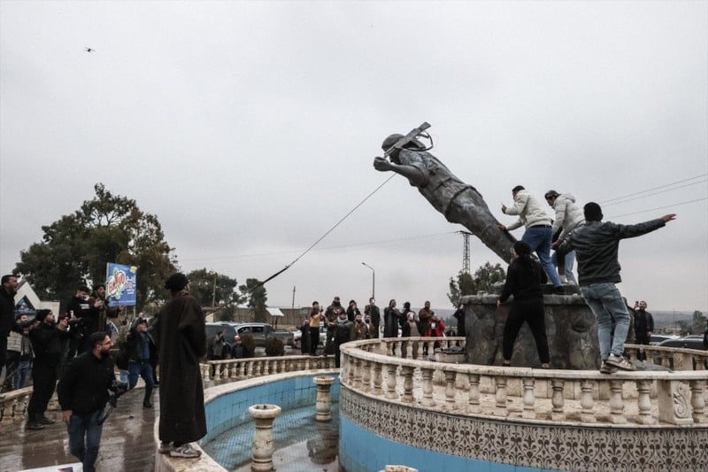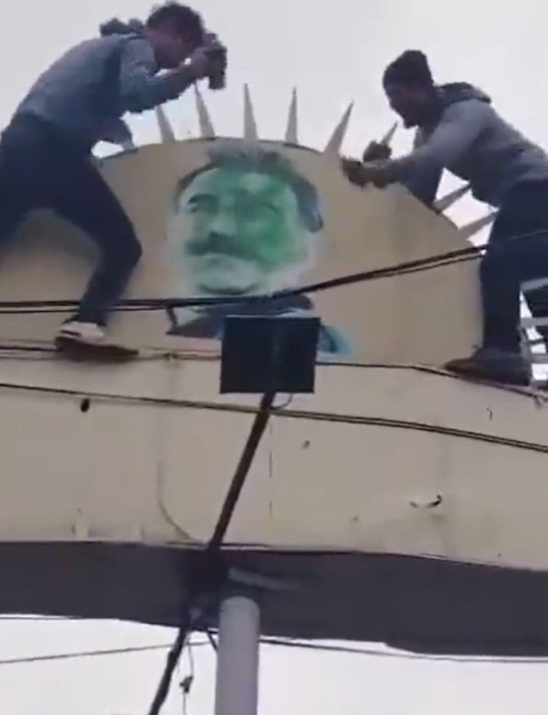 Suriye ordusunun kontrolü sağladığı Rakka kırsalındaki Tabka kentinde halk, terör örgütü YPG'nin Suriye uzantısı SDG'e ait heykeller yıkılırken, paçavralar ve Öcalan fotoğrafları da ortadan kaldırılıyor.