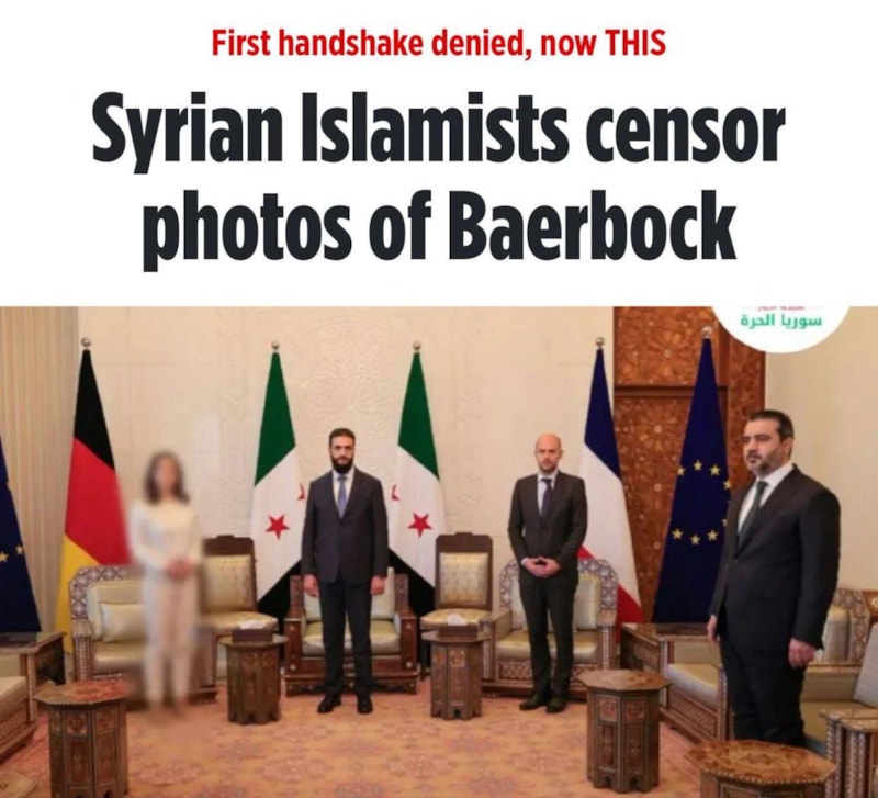 Paylaşımda, eş-Şera'nın elini sıkmayı reddeden Alman Bakan Baerbock, blurlanmış halde görüldü.
