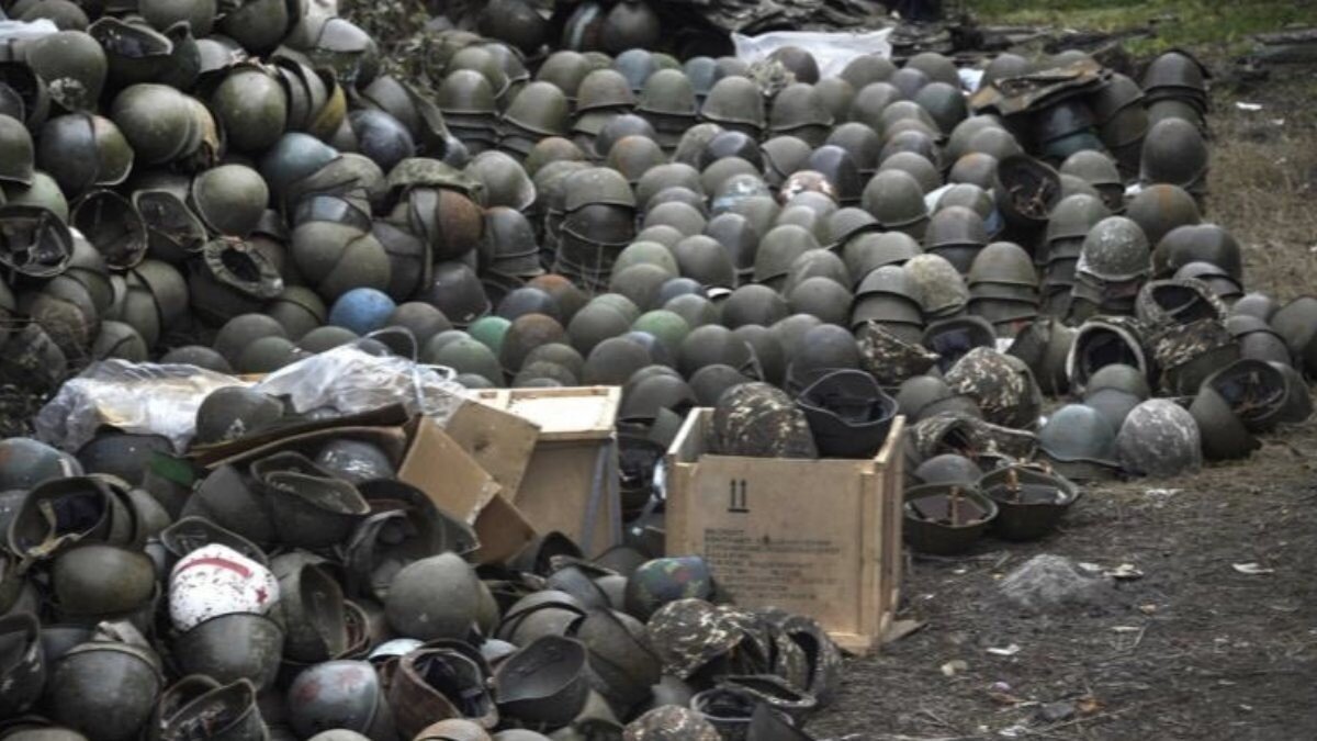Bölgede temizlik çalışması yapan Azerbaycan askerlerinin topladıkları çelik başlıklar ise dikkat çekti.