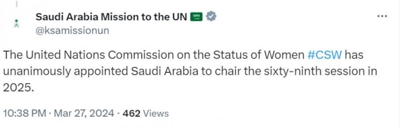 Suudi Arabistan Birleşmiş Milletler Daimi Temsilciliği, Suudi Arabistan’ın BM Kadının Statüsü Komisyonu toplantısında oy birliği ile başkan seçildiğini duyurdu.
