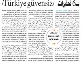 Türkiye'ye gitmeye hazırlanan Suudi turistleri uyaran gazete, haberinin başlığını Türkçe attı.
