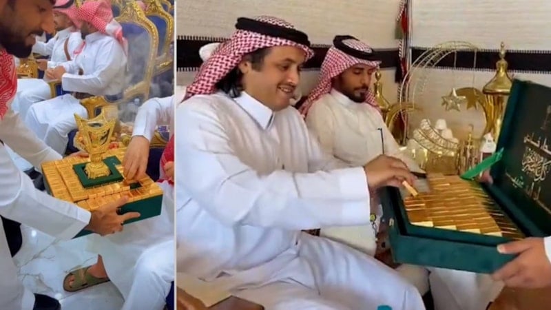 Suudi Arabistan'da bir düğünde çekilen görüntülerde, bir kişinin 24 ayar altın külçelerini, misafirlere dağıttığı iddia edildi.