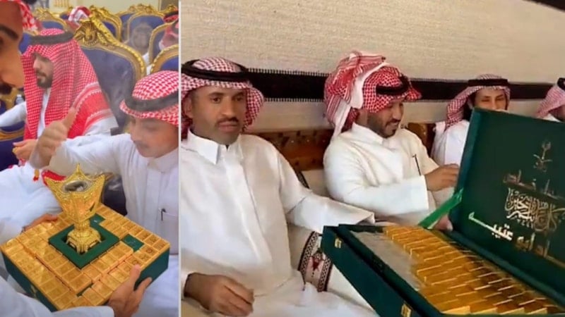 Suudi Arabistan'da bir düğünde çekilen görüntülerde misafirlere dağıtılan ve altın olduğu iddia edilen külçeler, sosyal medyayı ikiye böldü.