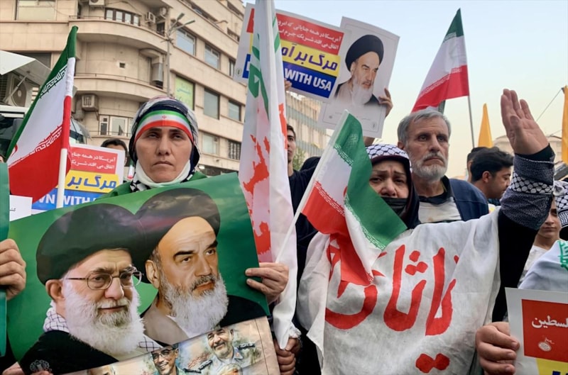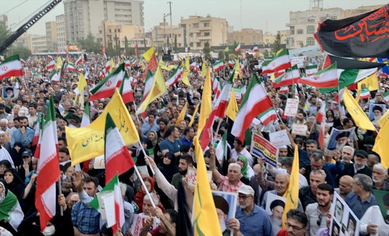 İran Silahlı Kuvvetleri ve Devrim Muhafızları’na destek mesajlarının öne çıktığı gösteride, "Kahrolsun İsrail", "Kahrolsun ABD", "Siyonist rejim yok olacak", "Liderime canım feda" ve "Taviz yok" yazılı pankartlar taşındı.