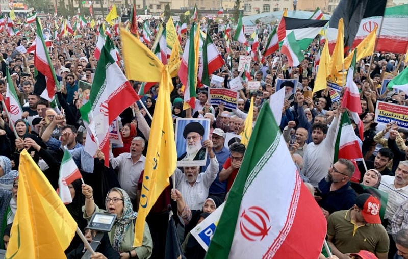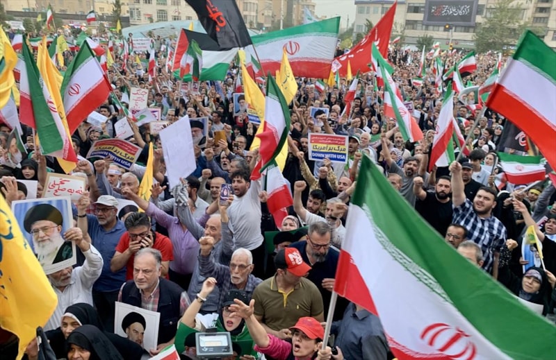 Ellerinde İran bayrakları taşıyan göstericiler, ABD ve İsrail aleyhine "Cezalandırma devam ediyor", "İran kazandı", "Liderimizin arkasındayız", "Nükleer silah hakkımız" ve "Biz savaşmayı bilen bir milletiz" sloganlar attı.