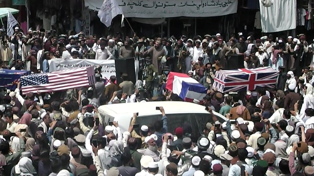 Cenaze töreninde ABD, İngiltere ve Fransa bayraklarına sarılı tabutlar dikkat çekti. Taliban destekçileri, tabutları elden ele dolaştırdı.